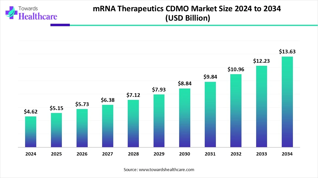 Ottawa, Oct. 15, 2025 (GLOBE NEWSWIRE) -- The global mRNA therapeutics CDMO market size was valued at USD 4.62 billion in 2024 and is predicted to hit around USD 13.63 billion by 2034, rising at a 11.37% CAGR, a study published by Towards Healthcare a sister firm of Precedence Research.