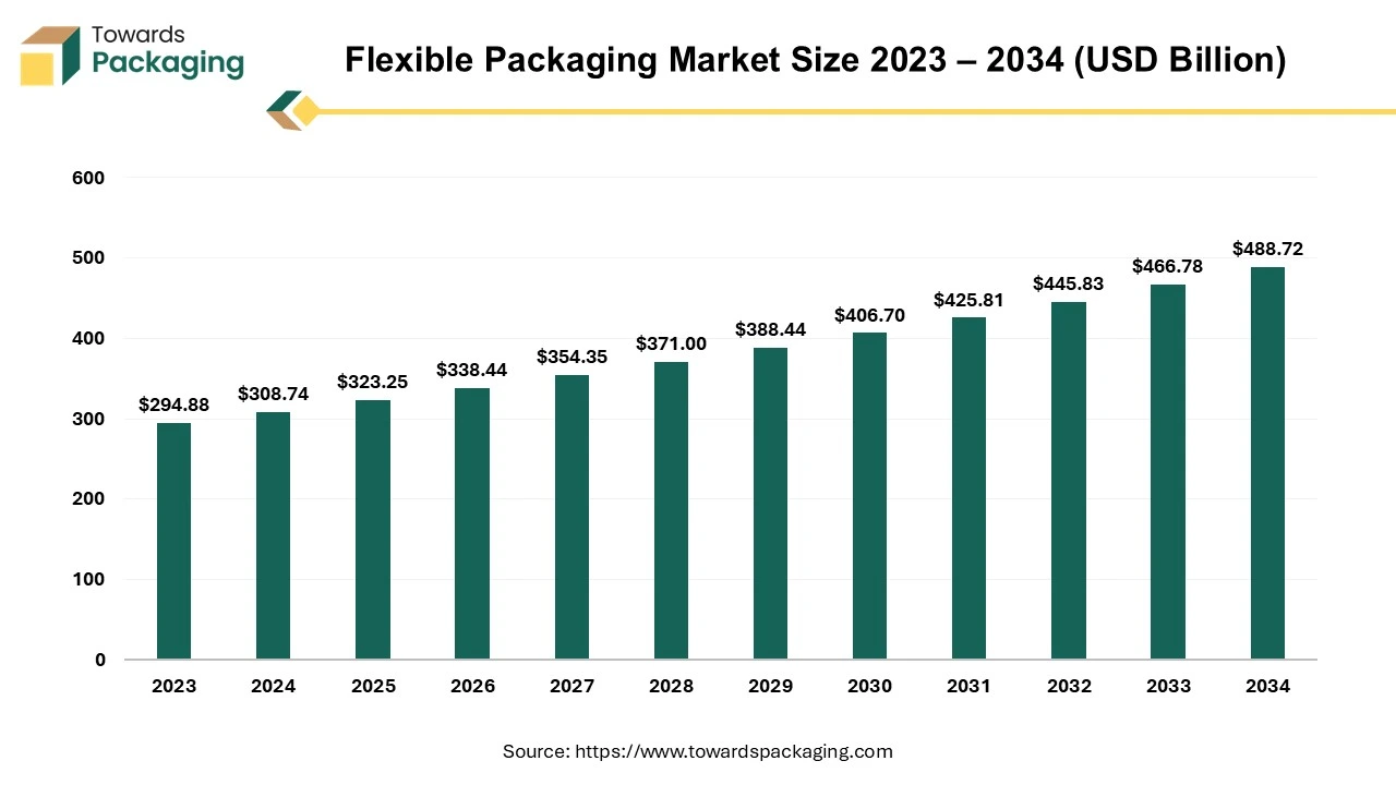 As detailed in the latest report by Towards Packaging, the global flexible packaging market is forecast to grow from USD 338.44 billion in 2026 to about USD 488.72 billion by 2034, at a CAGR of 4.7% between 2025 and 2034.